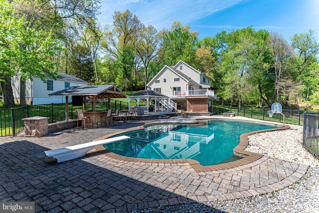 Experience the rare opportunity to own a pristine five-acre private estate located within the highly desirable Hereford Zone school district. Set back in a serene, park-like setting, this exceptional property is surrounded by mature trees and neighboring farmland, offering a true sense of privacy while remaining conveniently close to everyday amenities. The grounds are a nature lover’s dream, featuring a freshwater stream, a stocked pond, and expansive open space ideal for recreation, relaxation, or equestrian use. Whether you enjoy fishing, peaceful walks, or simply taking in the beauty of the outdoors, this property provides a tranquil retreat with endless possibilities. The three-story residence is thoughtfully designed with an open-concept main level highlighted by soaring 20-foot ceilings, oversized windows, a skylight, and a bay window that flood the home with natural light. Rich ¾-inch Acacia wood plank flooring runs throughout the main living space, anchored by a dramatic 20-foot stone fireplace that serves as a stunning focal point. The kitchen is both stylish and functional, featuring stainless steel appliances, granite countertops, and an expansive island with ample seating—perfect for entertaining or everyday living. The adjacent dining area offers picturesque views of the stream-fed pond and lush grounds through a charming bay window. Two generously sized bedrooms and bathrooms are also conveniently located on the main level. Upstairs, an open hallway with railing overlooks the main living area, enhancing the home’s airy and light-filled design. The second level hosts an impressive primary suite complete with a spa-inspired bathroom featuring a freestanding soaking tub, separate shower, and double vanity. An additional room on this level provides flexibility as a fourth bedroom, office, or guest space. The third floor adds even more versatility, ideal as a fifth bedroom, home office, or bonus/activity room to suit your lifestyle needs. The walk-out lower level is designed for relaxation and entertainment, offering ample space for gatherings and recreation, including a pool table. Modern efficiency meets comfort with a dual-zone geothermal heating and cooling system, along with a continuously circulating hot water loop for near-instant hot water throughout the home. Step outside to your own private resort-style oasis. The beautifully designed paver patio surrounds a 50-foot heated saltwater pool and a spacious cabana, creating the perfect setting for entertaining or unwinding. Additional outdoor features include a fire pit, a large tiki bar, and a hot tub seamlessly built into the elevated deck—ideal for year-round enjoyment. Additional highlights include an oversized attached garage and a substantial 30’ x 40’ detached garage/pool house complete with its own bathroom. This versatile structure also offers a full երկրորդ floor for storage, a covered parking or wash bay area, and a separate driveway access—perfect for housing equipment, recreational vehicles, or an extensive collection of hobbies and toys. This one-of-a-kind property offers a unique blend of privacy, luxury, and functionality—an exceptional place to call home.
