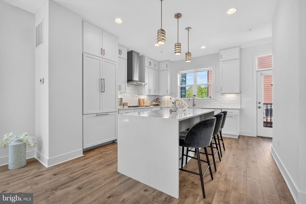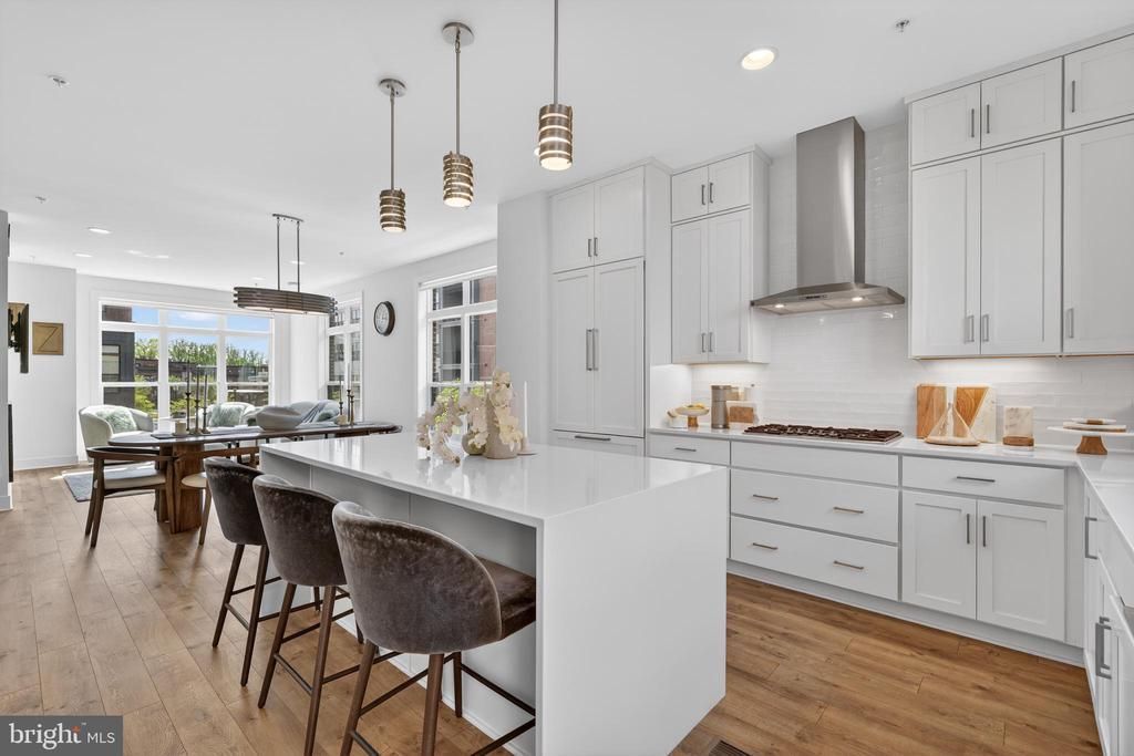 Stunning and immaculate 4-bedroom, 5-bath nearly-new EYA corner townhouse with a private elevator servicing all four levels, ideally located in the highly sought-after Tower Oaks community. With over $251,000 in premium upgrades and designer enhancements, this sun-filled residence offers refined style, modern comfort, and exceptional functionality throughout. The entry level offers a versatile bedroom, private home office, or fitness space with an adjacent powder room and direct access to the spacious two-car garage—perfect for today’s flexible lifestyle. The main level impresses with soaring 9.5-foot ceilings and a show-stopping gourmet chef’s kitchen appointed with top-tier cabinetry and appliances, including a paneled Bosch refrigerator, a top of the line Wolf multi-use double oven, Bosch dishwasher, and Thermador cooktop. Quartz countertops, an expansive waterfall island with abundant storage, upgraded tile backsplash, under-cabinet lighting, water filtration system, and designer pendant lighting complete this exceptional space. A spacious pantry, dedicated bar area, and seamless access to the private deck make entertaining effortless. The sunlit living room features a gas fireplace, while a stylish powder room completes the level. The third level offers a luxurious primary suite with a bump-out extension, two walk-in closets, and a spa-inspired en-suite bath with dual vanities and a walk-in shower. A generously sized second bedroom—large enough for a queen bed—includes its own en-suite bath and walk-in closet. A conveniently located laundry room with full-size Electrolux washer and dryer adds everyday ease. The top level is designed for elevated living and entertaining, offering an additional 4th bedroom with a full en-suite bath, a spacious media room with an electric fireplace, and access to a private rooftop terrace through double sliding doors with private treetop views. Ample storage is found throughout the home. Additional highlights include luxury vinyl plank flooring, solid oak hardwood stairs, a modern steel rail system, recessed LED lighting, and smart home window treatments. Major systems include a two-zoned HVAC and water heater (2023), offering peace of mind. All three upper-level bedrooms are equipped with Hunter Douglas smart blackout shades (2023). The oversized two-car garage provides additional storage. Residents enjoy access to exceptional amenities at The CORE, including a state-of-the-art fitness center, yoga studio, café and lounge, club rooms, outdoor pool, fire pits, grills, tot lot, green spaces, sports courts, pickleball courts, and an on-site property manager—all for a low monthly HOA fee of $249. Ideally situated across from Clyde’s and just minutes to Park Potomac and Pike & Rose, this coveted EYA Bailey model offers convenient access to top-rated dining, shopping, parks, and major commuter routes including I-270, as well as nearby Twinbrook, North Bethesda, and Grosvenor Metro stations—delivering luxury living with unmatched convenience. A rare opportunity to own one of EYA’s nearly-new elevator townhouses. Truly a must see!